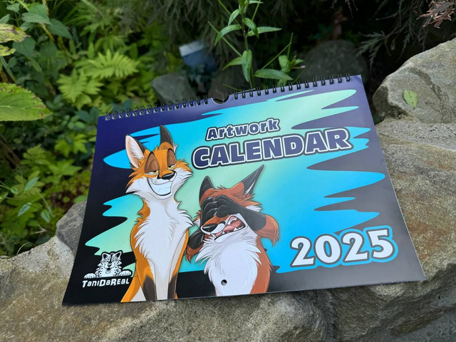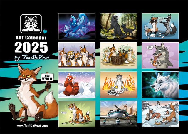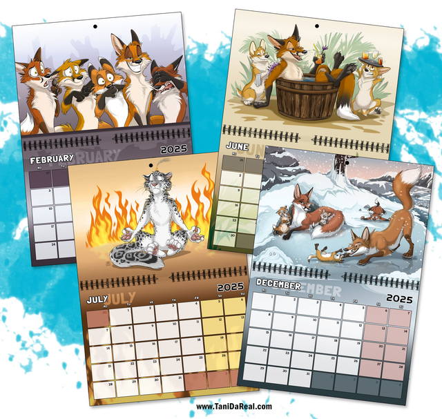 Featuring 12 months of colorful artwork by the artist TaniDaReal – Foxes, wolves, cats, tigers, red pandas, snow leopards, corgis and more!